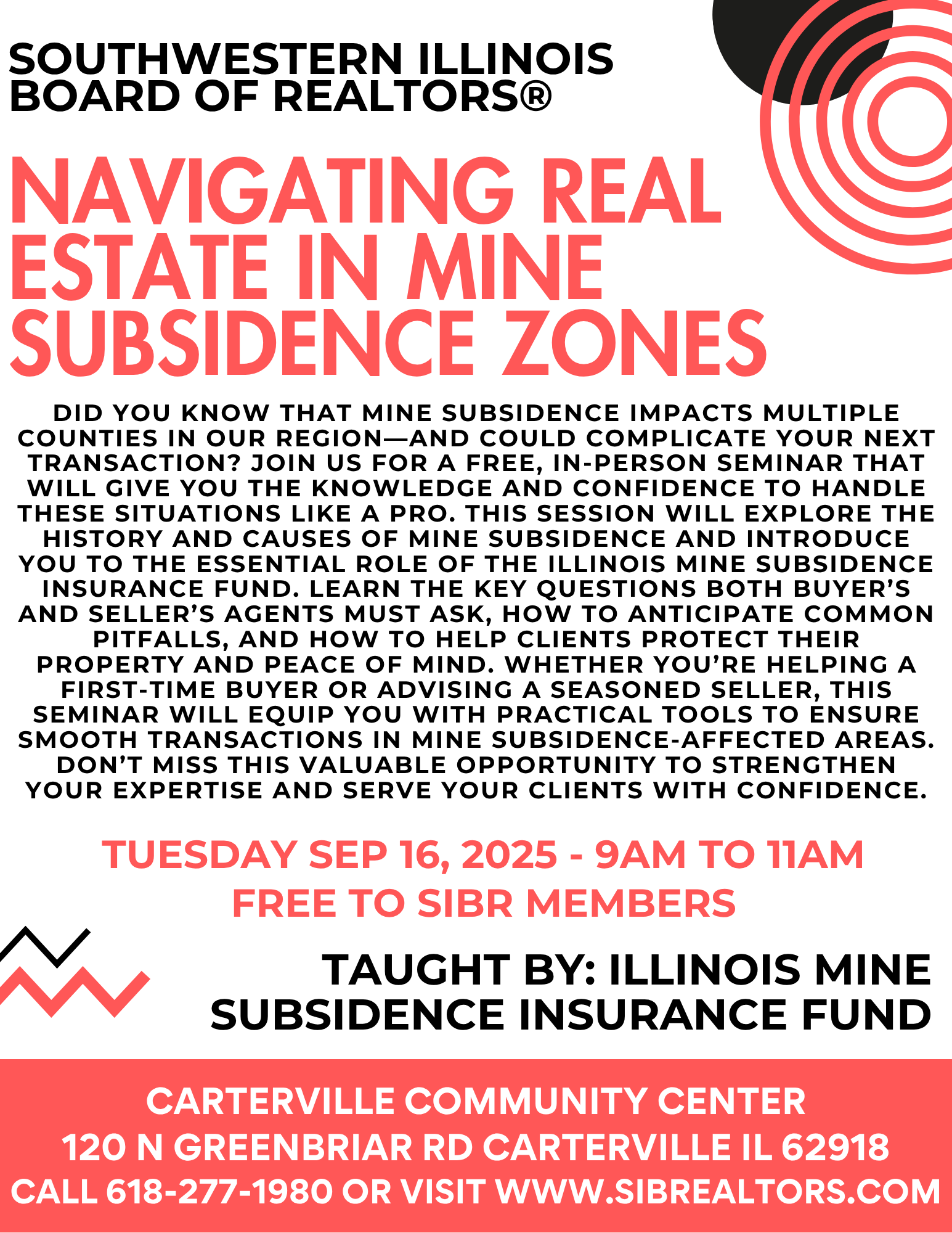 Did you know that mine subsidence impacts multiple counties in our region and could complicate your next transaction? Join us for a free, in-person seminar that will give you the knowledge and confidence to handle these situations like a pro. On Tuesday, September 16, 2025, from 9:00 AM to 11:00 PM at the Carterville Community Center. This session will explore the history and causes of mine subsidence and introduce you to the essential role of the Illinois Mine Subsidence Insurance Fund. Learn the key questions both buyer’s and seller’s agents must ask, how to anticipate common pitfalls, and how to help clients protect their property and peace of mind. Whether you’re helping a first-time buyer or advising a seasoned seller, this seminar will equip you with practical tools to ensure smooth transactions in mine subsidence-affected areas. Don’t miss this valuable opportunity to strengthen your expertise and serve your clients with confidence.