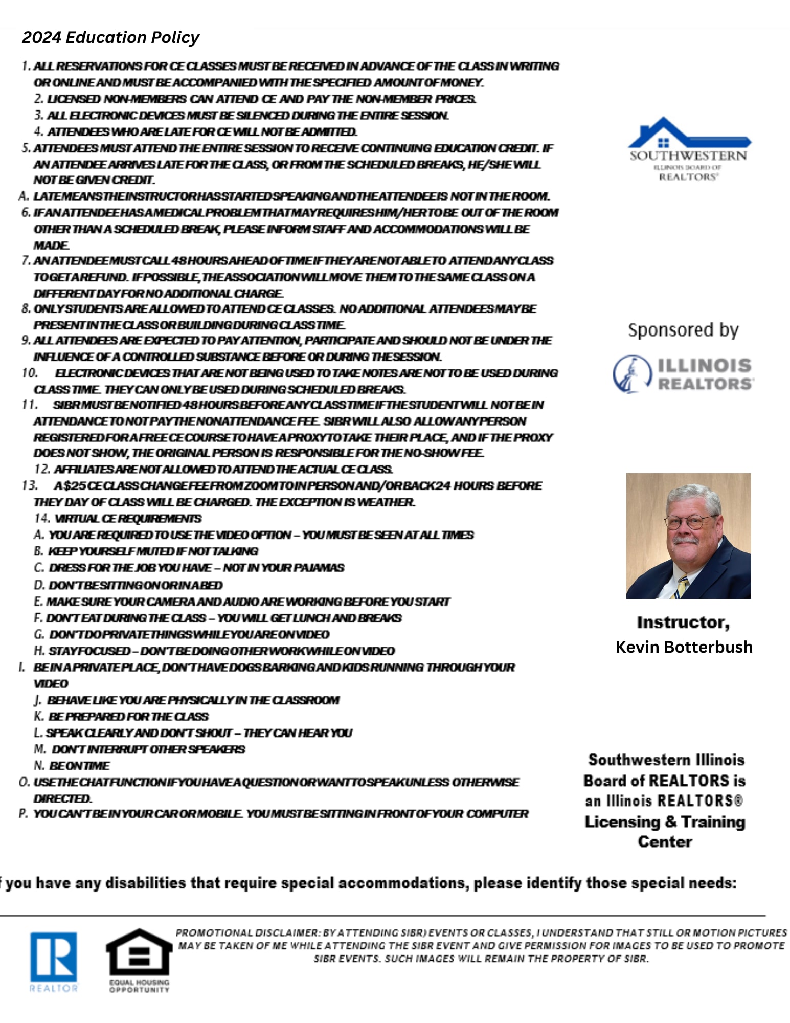 If you have any disabilities that require special accommodations, please identify those special needs by notifying SIBR - Tatyana Harriel, tatyana@sibrealtors.com.